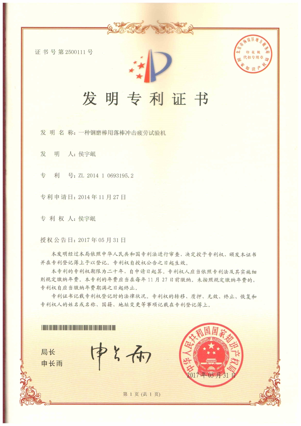 一種鋼磨棒用落棒沖擊疲勞試驗機